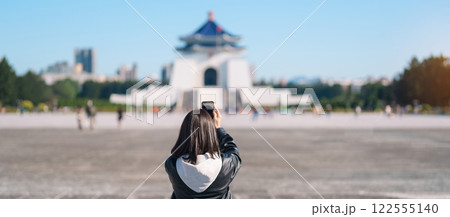 woman traveler traveling in Taiwan, female Tourist taking photo by mobile phone at National Chiang Kai shek Memorial or Hall Freedom Square, Taipei City. Popular landmark and attractions