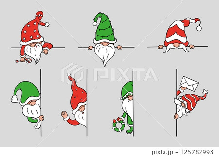 Gnomes peeking. Funny dwarves looking from corner. Banners with scandinavian style dwarf, christmas elves decorative design, neoteric vector elements