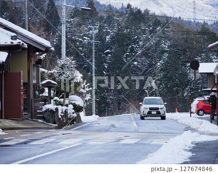 冬の中山道の観光名所馬籠宿の町並みと乗用車の様子
