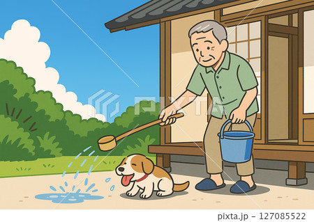 昼食前のひととき、女性が箒で掃除をする水彩画風イラスト、温かい自然光が室内に差し込み、心安らぐ