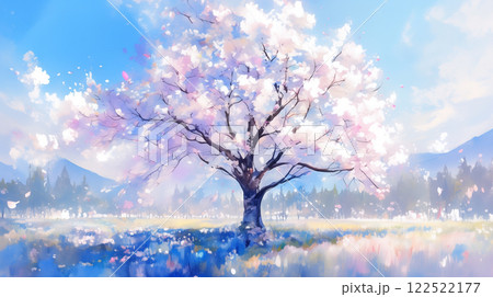 青空に舞う桜の花びら|陽光が輝く春の草原と満開の一本桜