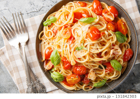 Shrimp spaghetti with tomato sauce served on ceramic plate. Mediterranean cuisine, seafood lunch and Italian restaurant dining.
