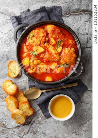 Chicken Bouillabaisse soup in a rich tomato-vegetable broth served with toasted baguette and rouille sauce, close-up in a pan. Vertical top view
