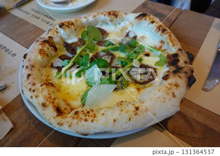 Caprese pizza tomatoes, mozzarella and basil on light wooden table