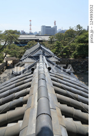 高松城跡の月見櫓から見る渡櫓と披雲閣、その向こうに高松市街
