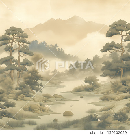 日本の風景をモチーフにした和風壁紙イラスト。繊細なタッチと柔らかな色合いが調和し、落ち着いた雰囲気