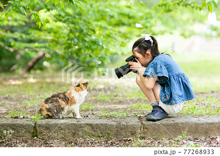 猫の写真を撮る少女