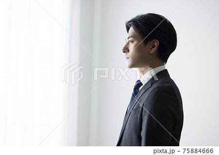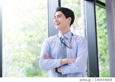 窓際で考える腕を組み笑顔で考えるビジネスマン 成功や信頼など、未来を見上げるポシティブなイメージ