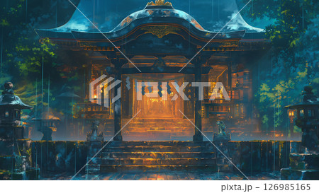 ゲーム背景 和風ファンタジー夜の提灯が付いた宮殿の回廊入口