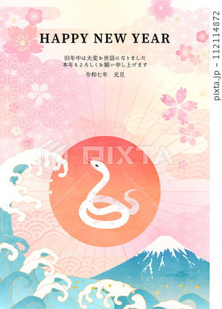 桜と富士山と波と蛇のかわいい2025年巳年の年賀状背景イラスト(ベクター)