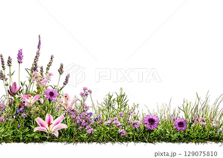 Colorful Floral Border with Lilies, Lavender, and Various Wildflowers on White Background
