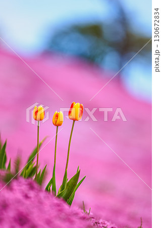 ピンクの絨毯に映える黄色と赤のチューリップ