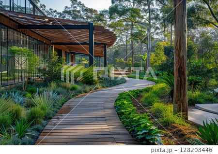 Modern Tropical Greenhouse with Wooden Walkway Amid Lush Vegetation