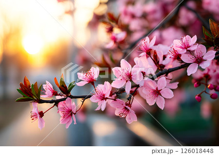 Dreamy spring vibe with sunlit cherry blossoms in soft focus and bokeh style background