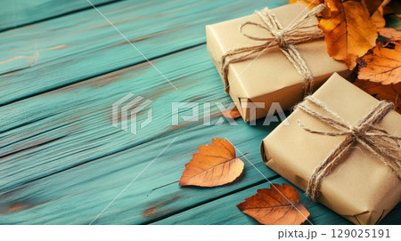 autumn gifts wrapped in kraft paper on wooden background
