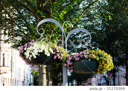 Beautiful flowers on the poles in the form of pots