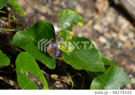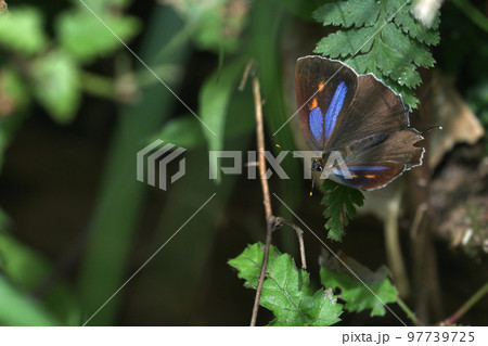 ヒサマツミドリシジミ 秋 給水に降りてきた雌 翅を開いて体を温める