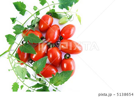 完熟ミニトマト・アイコの葉と真っ赤な実・白バック横位置・斜俯瞰