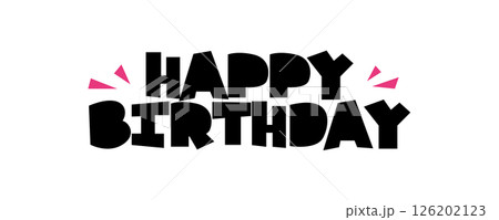 Happy birthday bold graphic lettering with pink festive accents. Modern playful design for events, party invitations, greeting cards, posters. Vector illustration.
