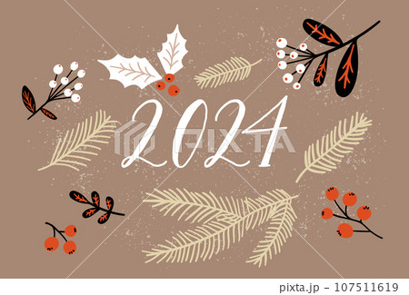 2024 new year greeting card, handwritten numbers on brown kraft paper. Decorated with branches, holly berries and twigs of Christmas tree.