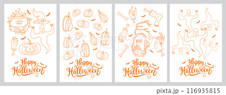 Set of Halloween greeting cards in simple doodle minimalist style on white background. Han drawn vector illustrations with funny Halloween elements - pumpkin lanterns, zombie and ghost.