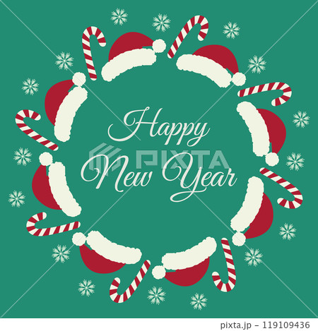 Santa Claus hats, Candy Cane and snowflakes Circle frame border with Happy New Year inscription