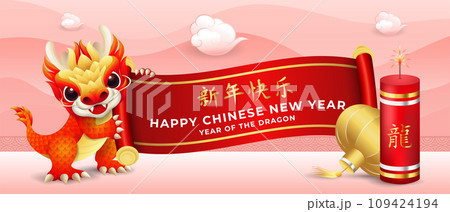 Chinese new year 2024 banner design, cute little dragon holding scroll with lantern and firecrackers vector