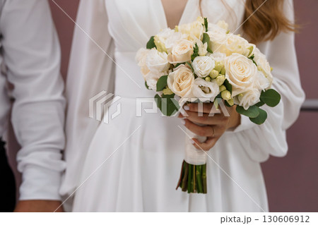 Elegant Bridal Bouquet: White Roses and Greenery Held by Bride in Wedding Dress, Soft Focus Romance
