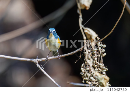木の実を食べるために羽ばたいて飛び立つ幸せの青い鳥、可愛いルリビタキ(ヒタキ科)。 日本国東京都文