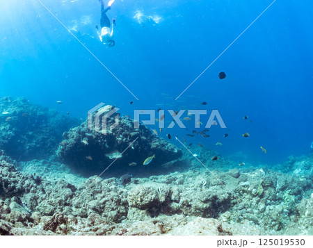 カタマランヨットのダイビングクルーズ船の半水面撮影。美しいサンゴ礁と熱帯魚の群れ。 沖縄県島尻郡慶良