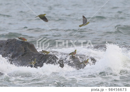 波しぶきとアオバトの群れ(大磯町照ヶ崎海岸)