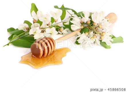 Honey stick with flowing honey and flowers of acacia isolated on white background