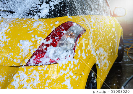 Yellow car washed in self serve carwash, shampoo spraying from hose to roof, streams of foam flowing down the window.