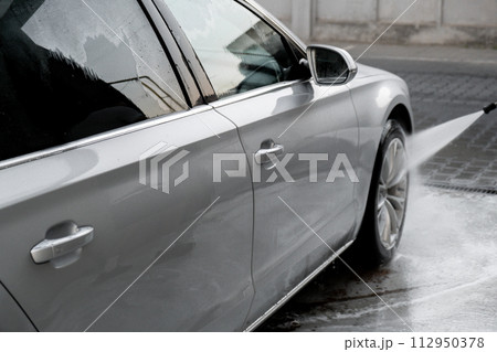 Washing luxury silver car on touchless car wash. Washing sedan car with foam self-service and high pressure water. Winter cleaning in car wash. Cleanliness environment