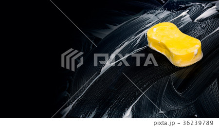 people worker man holding hand yellow sponge and bubble foam cleanser window for washing car. Concept car wash clean. Leave space for writing messages.