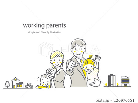 共働きで子育てを頑張るポジティブな家族 シンプルでお洒落な線画イラスト