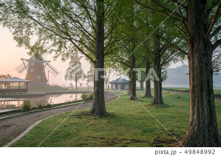 朝焼けのあけぼの山農業公園の水面に映る風車