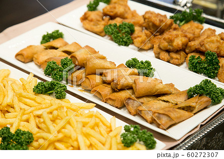唐揚げと生春巻きとオニオンフライとポテト お酒に合う料理 おつまみ料理 いろいろな揚げ物 イメージ素材