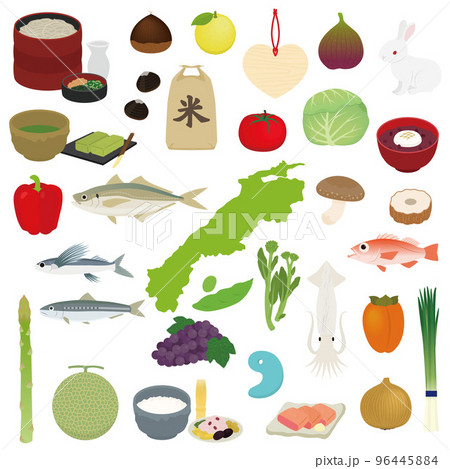 中国地方の人気グルメ・名産のイラスト①(松葉ガニ、焼牡蠣、ふぐ刺身、お好み焼き、しじみ)