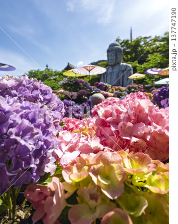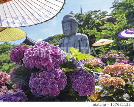 初夏を彩る極彩色の紫陽花と大仏の共演