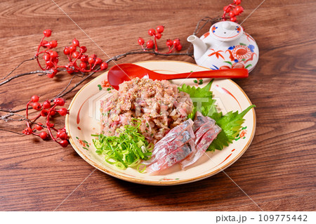 鯵アジのなめろう、たたき、アジの刺し身、海鮮料理。