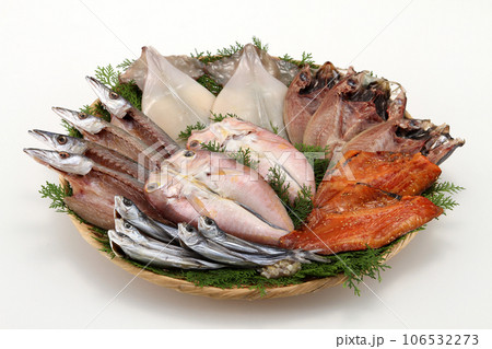 魚の干物ザル盛りイメージ・干物集合イメージ・一夜干しイメージ・干物イメージ