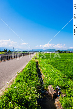 真っすぐに伸びる田んぼの用水路 安曇野市
