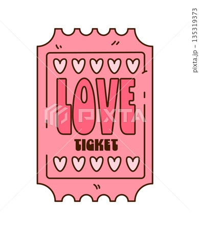 Valentines day love ticket retro groovy decoration or symbol. Romantic party retro sticker, romance holiday vector element. Saint Valentine decoration with pink hearts and typography on paper ticket