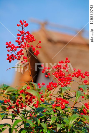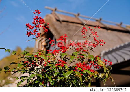 南天と茅葺き屋根
