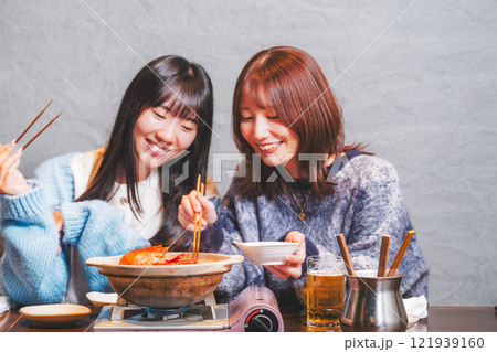 カニ鍋で女子会をする若い女性【撮影協力・海鮮居酒屋 魚魯こ】