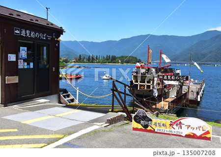冨士河口湖町 河口湖と河口湖遊覧船天晴桟橋と天晴と夏空