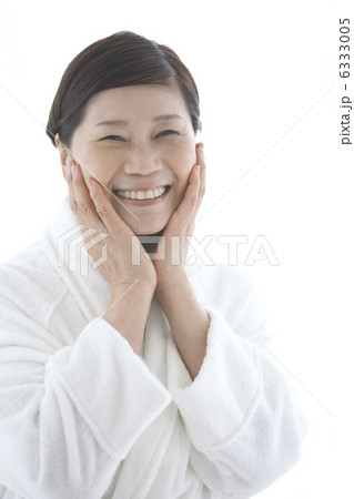 顔に手をあてる肌の綺麗な日本人女性(アジア人・白背景・背景なし)