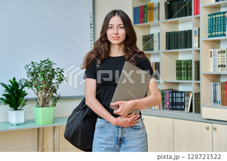 Close-up selfie portrait of teenage cheerful female looking at web camera