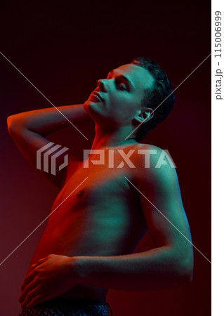 Moment of calm. Young attractive man posing shirtless holding hand behind his neck in neon light against gradient background.